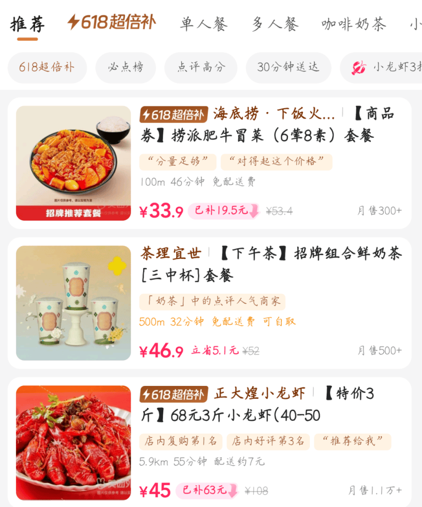 升级后,“神抢手”还在tab栏新增了“限时加倍补”专栏。美团外卖直接对这一栏的商品进行补贴,在保证商户利润的同时,也让消费者买到更具性价比的产品。