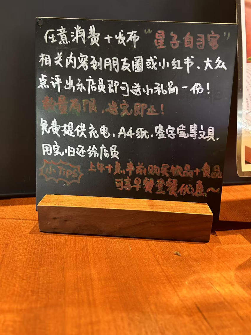 不过,因为“星子自习室”是直接利用店内原有客座区域,并未设置独立格挡,而是与饮品区共用长桌,因此在客流高峰时,“星子自习室”还是会有些吵。此外,当前“星子自习室”的开放时间,不同的门店会不同,有的是周一到周五开放,有的是周一到周日开放。一天的开放时间段也不尽相同,有的是早上七点左右到晚上十点,有的则是早上十点到中午十二点等时段。
