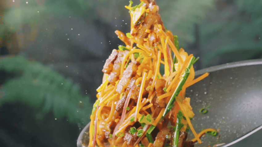为了进一步丰富口感、风味层次和营养,滇野火烧现炒系列与蒙自源的好元气老鸡炖汤共同打造了一场具有三重感官暴击的嗦米线三部曲:一拌肉香、二嗦米线、三喝鸡汤。一浓一鲜,一重一清,把云南的烟火气与山野的清新感完美结合在了这一碗米线里。