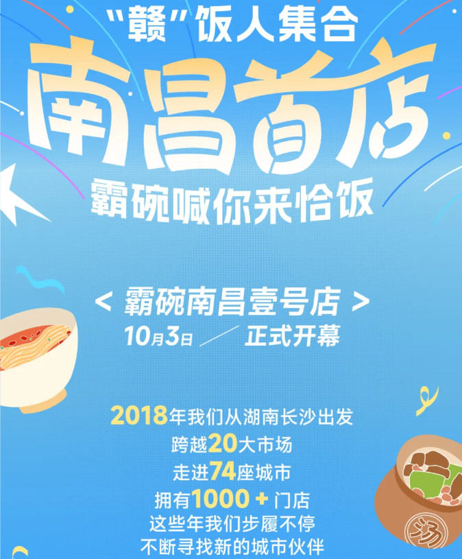 近日,霸碗盖码饭在官方公众号宣布开出南昌首店的同时,正式对外确认其全国门店总数已突破1000家。