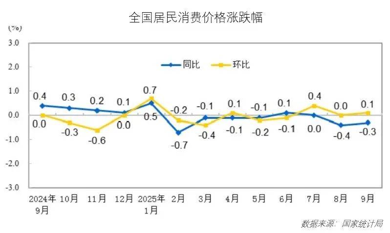 2025年9月,全国居民消费价格同比下降0.3%,环比上涨0.1%。其中,城市居民消费价格同比下降0.2%,环比持平;农村居民消费价格同比下降0.5%,环比上涨0.2%;全国食品价格同比下降4.4%,环比上涨0.7%。