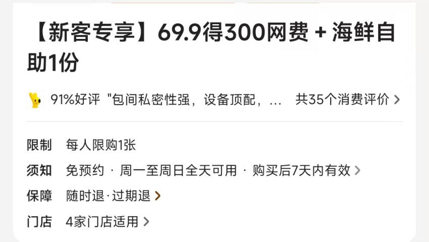 据九派新闻报道,该网吧提供的餐饮服务覆盖了早餐、晚餐和夜宵多个时段消费场景。价格上,该网吧的包含上网的单人自助套餐只需要69.9元,新顾客或充值200元即可获赠一餐。若在网吧内(胶囊或电竞酒店)住宿,则可免费享用三餐。