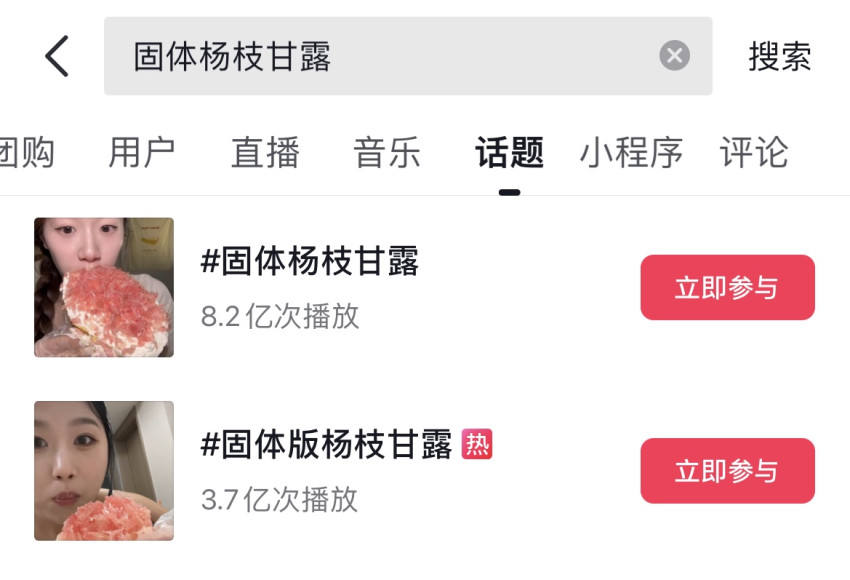 据小红书数据显示,#固体杨枝甘露单一话题讨论量达45.9万,浏览量近9000万;在微博,“奶皮子火完固体杨枝甘露火”“固体杨枝甘露走红卖到40元1份”等多个词条冲上热搜;而在抖音平台,固体杨枝甘露关联话题的播放量更是累计超10亿次。