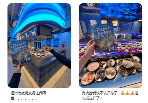 今年初,海底捞在福建开设首家海鲜主题门店,店内设有明档水产池,提供蛏、沼虾、黑虎虾、生蚝、鲍鱼、红螺、小青龙、带子、青口贝等鲜活海鲜。