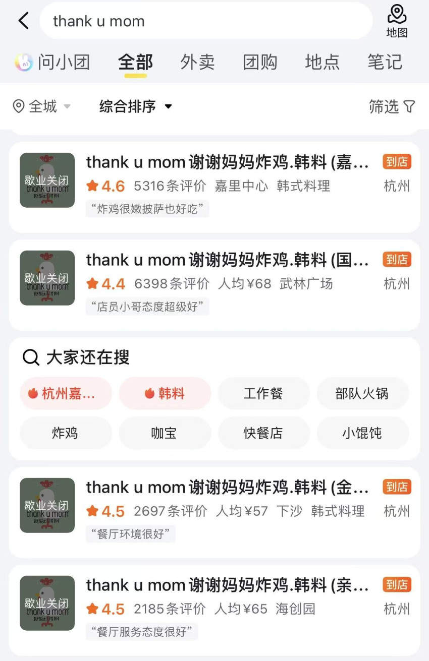 11月20日,红餐网从美团平台查询确认,目前Thank u mom在杭州嘉里中心、武林广场、海创园、下沙等多地的门店确实均显示“歇业关闭”状态,仅剩嘉兴桐乡市一家门店在营业。