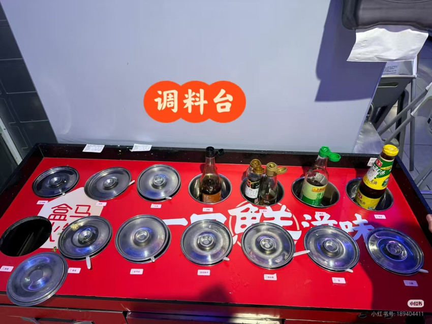 而除了充足的食材供给,在商超的堂食区,火锅设备也一应俱全。桌上摆放着电磁炉设备,调料台处还免费提供香油、香醋、沙茶酱等多种小料。