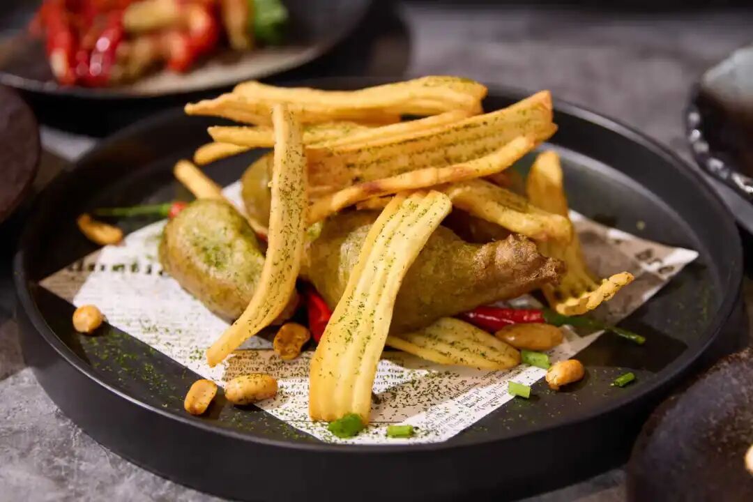 对于绝大部分餐厅而言,选用直薯条来创新菜品是最简单的做法,像蓝威斯顿有一款3/16''冷冻裹粉薯条,在经过超细原切后,比普通的1/4英寸薯条更纤细,酥脆感更集中。这种“极细身段”使薯条在各类爆炒、香煸的菜式中都能出彩,比如糖醋脆鳝香脆细薯条。