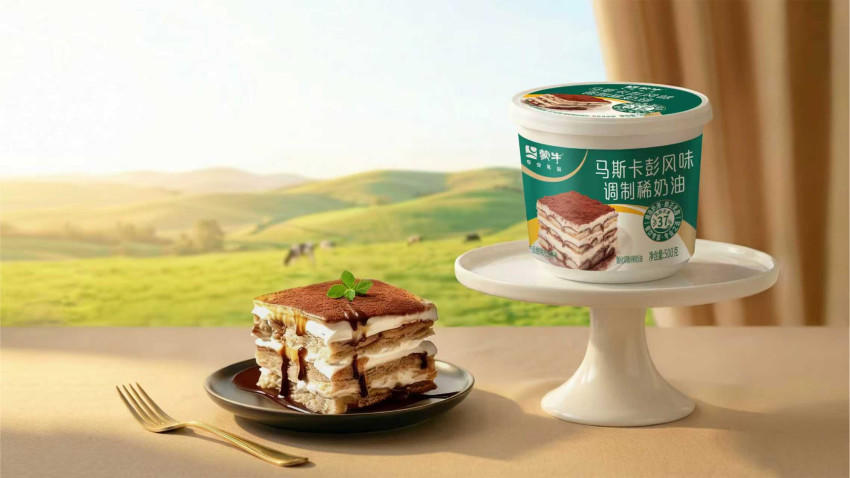 2. 蒙牛马斯卡彭风味稀奶油以以“国产清洁标签开创者”定位破局,通过自主研发技术,品质媲美进口产品。采用清洁标签配方,不含添加剂,配合稳态化专利技术,在持泡性与硬度上表现优异。其醇厚奶香与细腻质地,是提升产品价值感的关键要素。