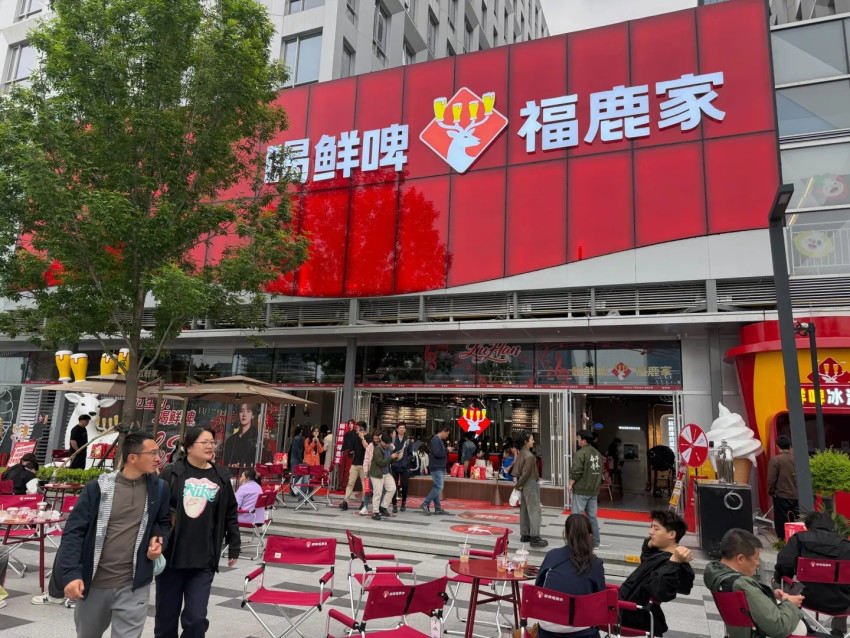 从装修上看,该旗舰店外观延续了品牌标志性的红色主调,搭配大面积落地玻璃窗,门头设有“喝鲜啤 福鹿家”的招牌和经典鹿头logo,门店内外均规划有就餐区,整体呈现出年轻、时尚的风格。