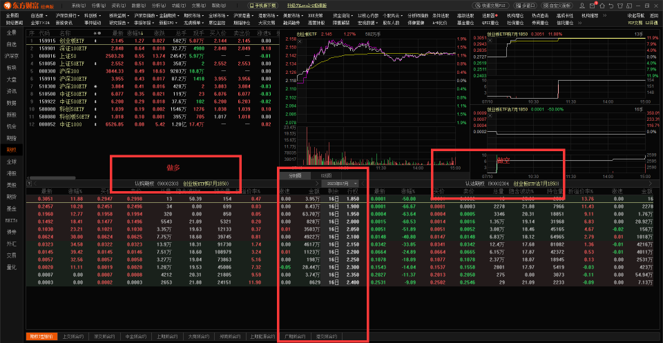 看上图,以标的物创业板ETF期权举例:认购就是做多也就是看涨期权,认沽就是做空,也就是看跌期权。