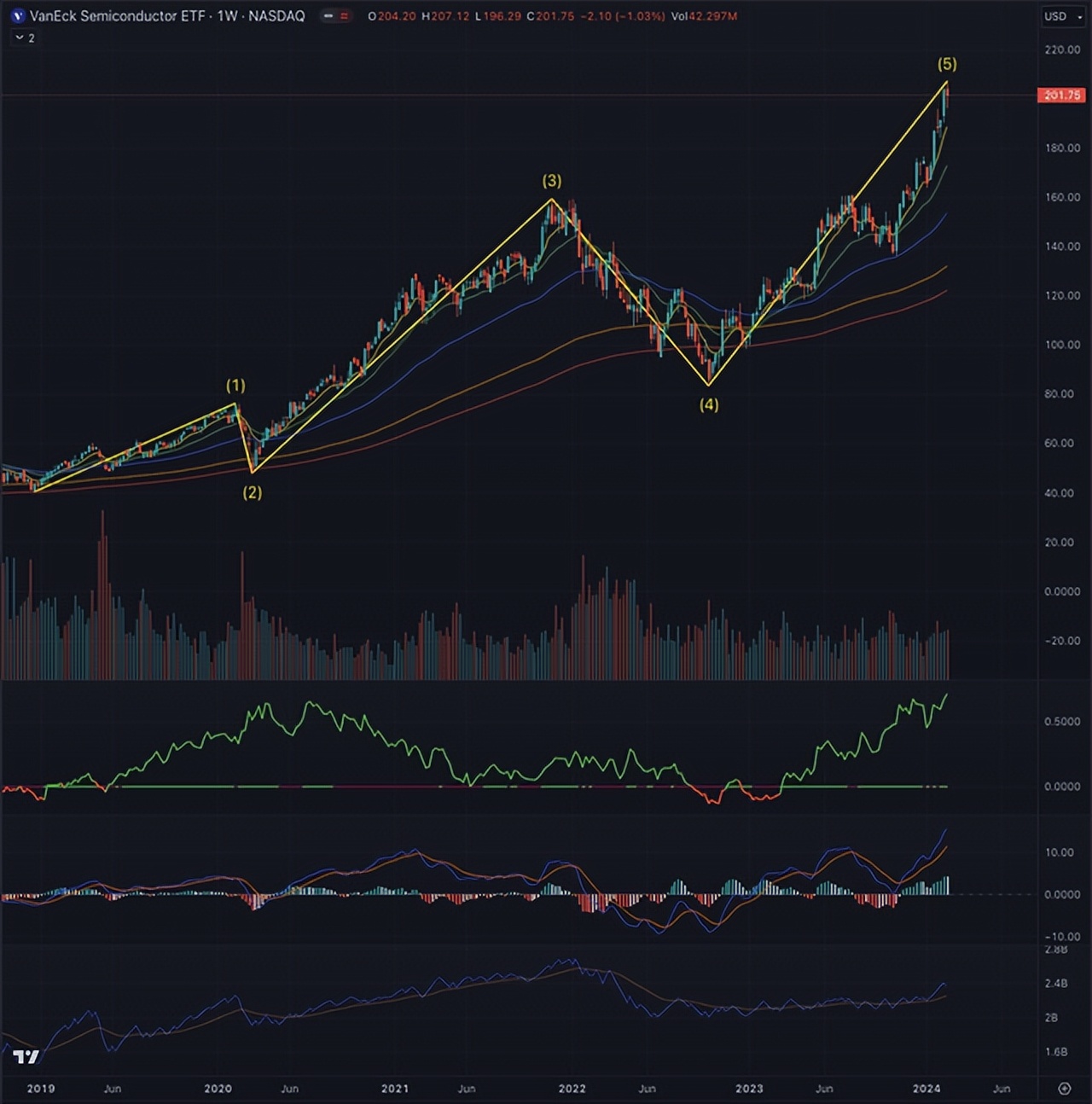 VanEck Semiconductor ETF(SMH)正处于五波脉冲序列的后期阶段,该序列已根据波浪结构成功形成,这表明第五波将在 193 美元至 206 美元的范围内延伸。尽管反弹仍有继续的空间,但有迹象表明健康修正可能即将到来。