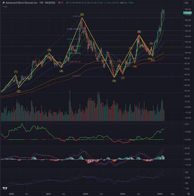 回顾周线图,很明显 AMD 遵循独特的价格走势模式。最初,它形成了五波脉冲序列,最终在 2021 年 11 月达到顶峰。随后,该股经历了三波调整序列,并于 2023 年 10 月结束。此后,AMD 经历了强劲的反弹,其特点是急剧上涨。上升。此次飙升推动该股突破 2021 年 11 月创下的前高点,最终于 2024 年 1 月 25 日创下 184.92 美元的历史新高 [ATH]。