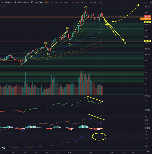 AMD 目前的分析表明,短期内可能出现过度扩张,其指数移动平均线 [EMA] 显着扩张,以及根据该股 MACD 的动力达到顶峰,以及最近买方压力的加速,就证明了这一点。虽然这些见解是从 AMD 的周图表中观察到的,但放大并在日图表上确认它们至关重要。该时间框架将为近期反弹的结构提供更透明的评估,这在周线图上可能不太明显。通过检查日线图,我可以更好地衡量动态并确定股票当前的轨迹是否可持续,或者修正阶段是否即将到来。