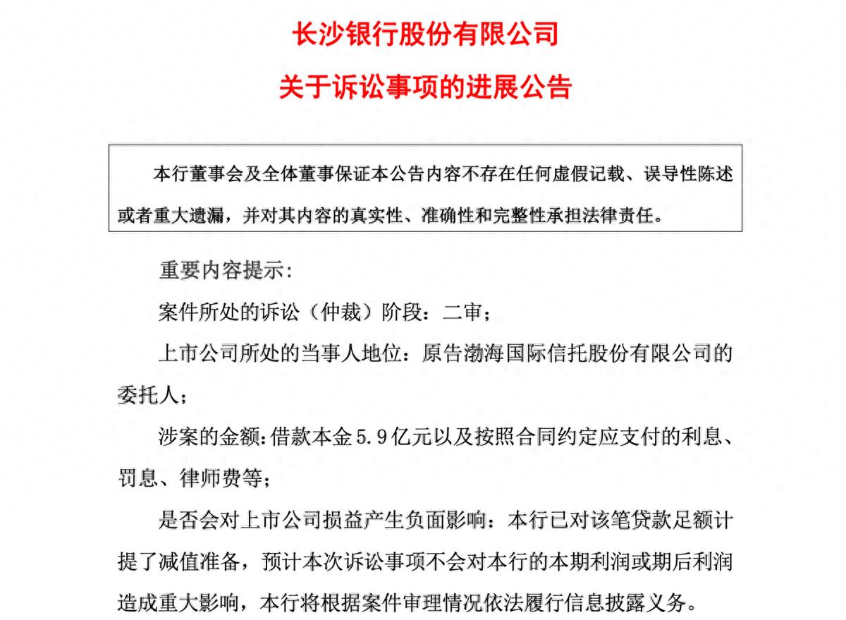 长沙银行表示,“本行已对该笔贷款足额计提了减值准备”,预计此诉讼案件不会对本行的当前或未来利润产生显著影响。