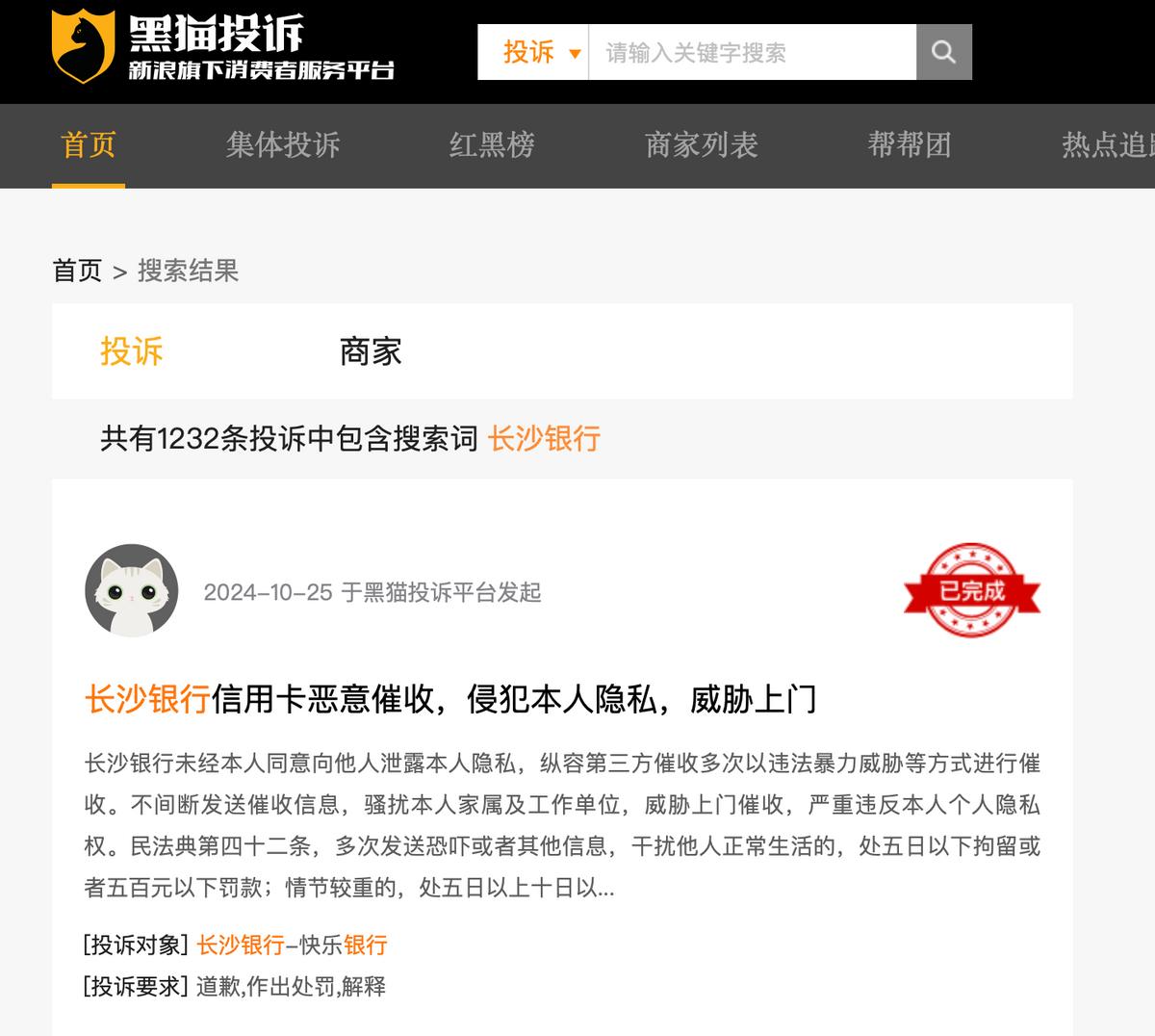 此外,在黑猫投诉网,搜索长沙银行,涉及的投诉量有1232条,其中,主要涉及恶意催收、侵犯隐私等问题。
