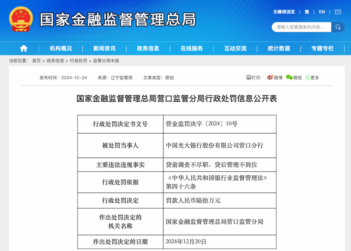 12月24日,国家金融监督管理总局营口监管分局行政处罚信息公开表显示,光大银行营口分行,因贷前调查不尽职、贷后管理不到位,被罚款60万元。