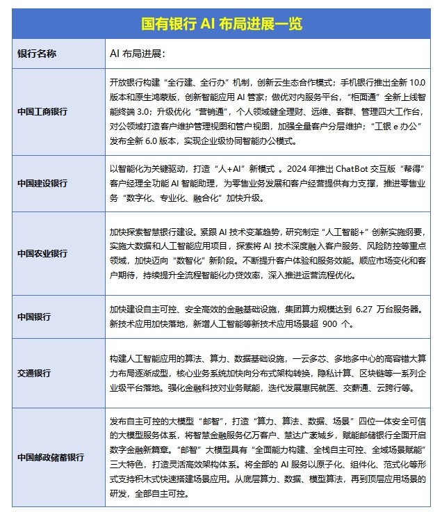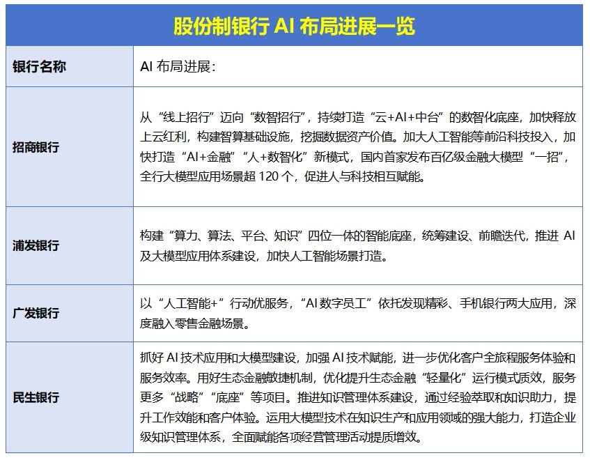 相比六大行更系统的方式,部分股份制银行也都在加快推进人工智能和大模型的结合。不少银行在做云、AI、平台打包推进的方案,已将这些技术用在日常的服务、知识整理和流程处理上。