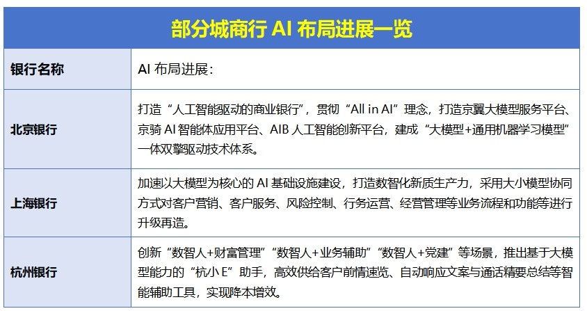 部分城商行在人工智能上也明显加快了步子,开始把AI当作重要工具来推进。他们不再只是用来做简单辅助,而是希望AI真正参与到业务里,帮忙提升效率、优化服务。