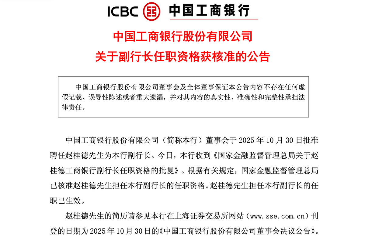 11月26日,工商银行(601398.SH)公告称,赵桂德先生的副行长任职资格获国家金融监管总局批复,赵桂德担任本行副行长的任职已生效。