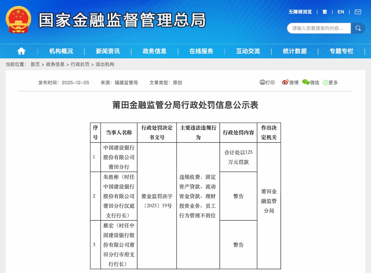 建设银行莆田分行被罚125万元,两支行行被警告