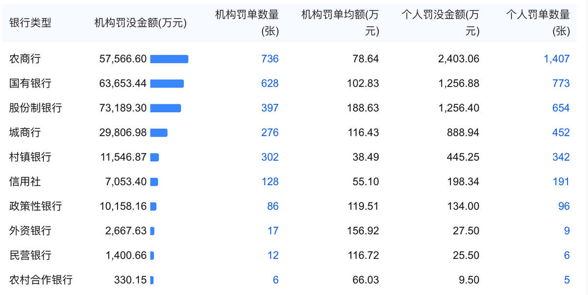 2025年,监管一共给农商行开出737张罚单(机构罚单不包括个人),罚没金额约5.77亿元;国有大行被开罚单628张,罚没金额约6.37亿元;股份制银行被开罚单396张,罚没金额约7.32亿元;城商行被开罚单276张,罚没金额约2.98亿元。