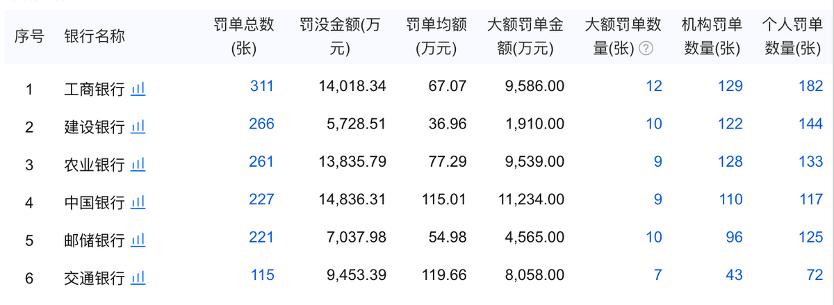而从罚单总金额来看,中国银行排名第一,其次为工商银行和农业银行,罚单总金额分别为14836.31万元、14018.34万元和13835.79万元。