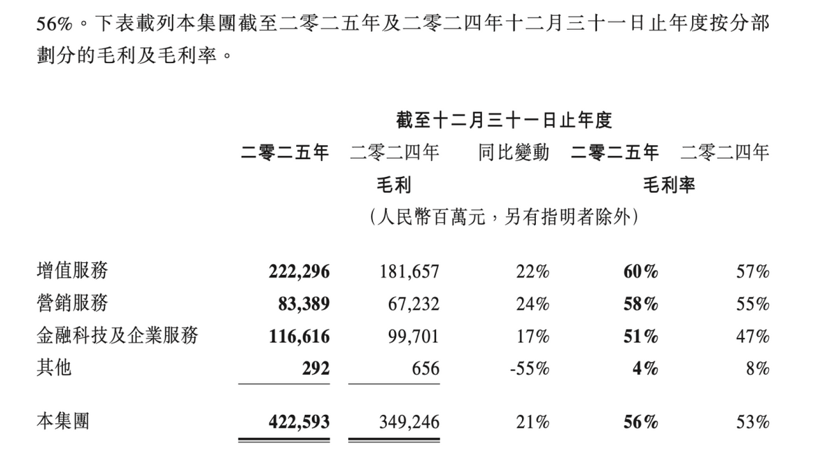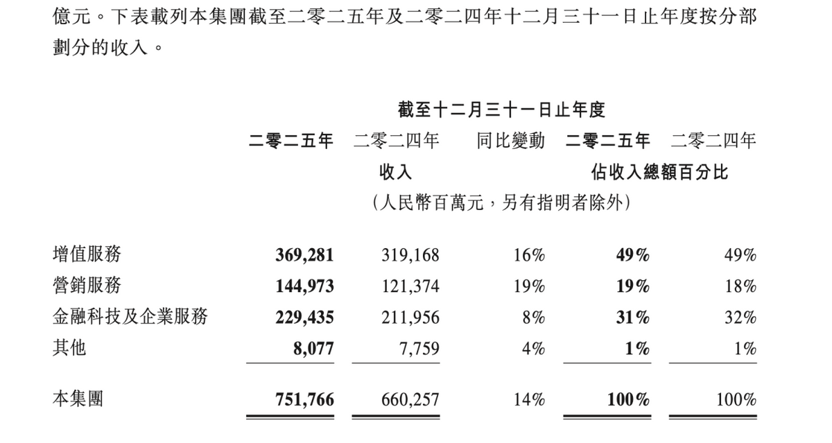 财报指出,企业服务收入在2025年同比增长接近20%,成为该板块增长的重要驱动力。这一增长主要受益于国内及海外市场对云服务(包括AI相关服务)需求的增加,以及由于微信小店交易额上升而带动的商家技术服务费收入增长。