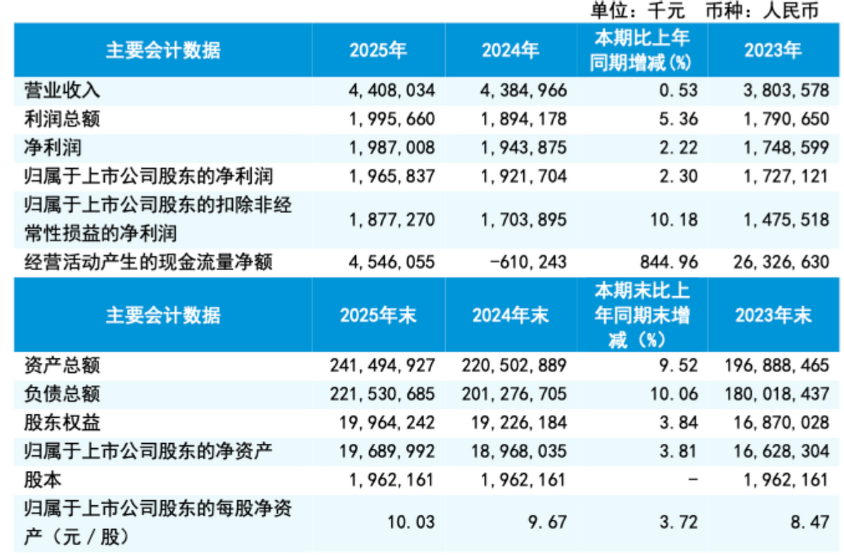 在披露业绩数据的同时,瑞丰银行也披露了2025年利润分配方案,拟以2025年12月31日的总股本1,962,161,395股为基数,每10股派发现金股利人民币2.10元(含税),不派送红股,不实施资本公积金转增股本。