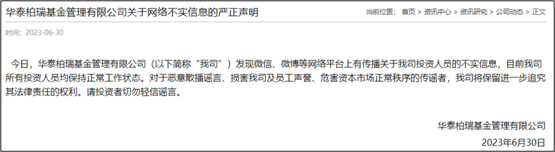 近日,华泰柏瑞基金公司,针对网上传闻其投资总监被带走的传闻,发布了一个严正声明,让这家中外合资基金公司再度进入人们的视野。
