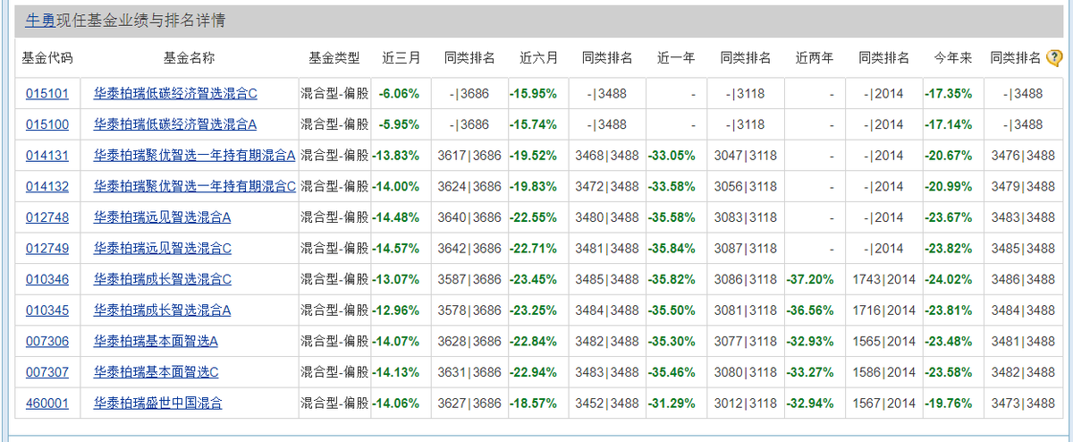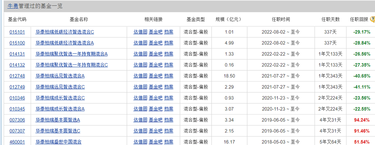 进一步查看华泰柏瑞这6只业绩倒数的基金,公司研究室发现,其基金经理竟然都是牛勇。
