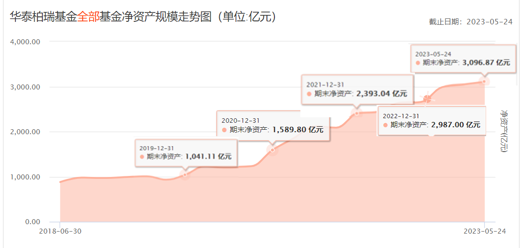 从华泰柏瑞资管规模看,2019年末1041亿,2020-2022,3年时间,规模就逼近3000亿。其中,有1300亿属于2020-2021年间扩增。
