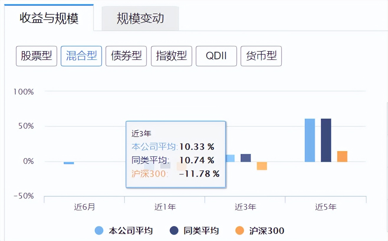 以混合型基金为例,近3年投资收益,华泰柏瑞平均10.33%,同行10.74%,沪深300下跌11.78%,因此,跑输同行0.41%,远远超过沪深300。