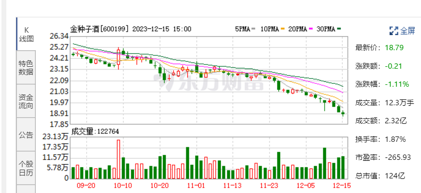 不过,投资者是否有足够的耐心等待就很难说了。截至2023年12月15日收盘,金种子酒A股股价收报18.79元/股,今年以来跌幅29.68%。