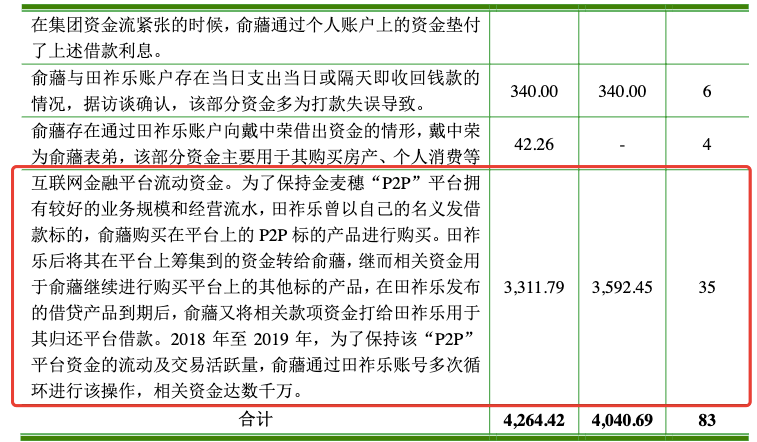 2018年至2019年,俞蘠通过田祚乐的账号多次在该“P2P”循环进行上述操作,资金笔数达35笔,相关资金达数千万。