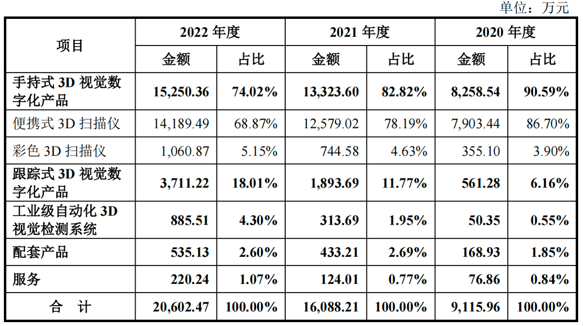 公司的收入由手持式3D视觉数字化产品(包括便携式3D扫描仪、彩色3D扫描仪)、跟踪式3D视觉数字化产品和工业级自动化3D视觉检测系统、配套产品及服务构成。其中手持式3D视觉数字化产品收入占报告期主营业务收入的比重均在70%以上,系思看科技最主要的收入来源。