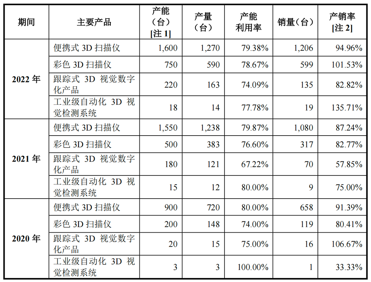 2020年至2022年,思看科技的便携式3D扫描仪产能分别为900台、1550台、1600台,各期产能利用率分别为80%、79.87%和79.38%;彩色3D扫描仪的产能分别为200台、500台、750台,对应各期产能利用率也均未超过80%。