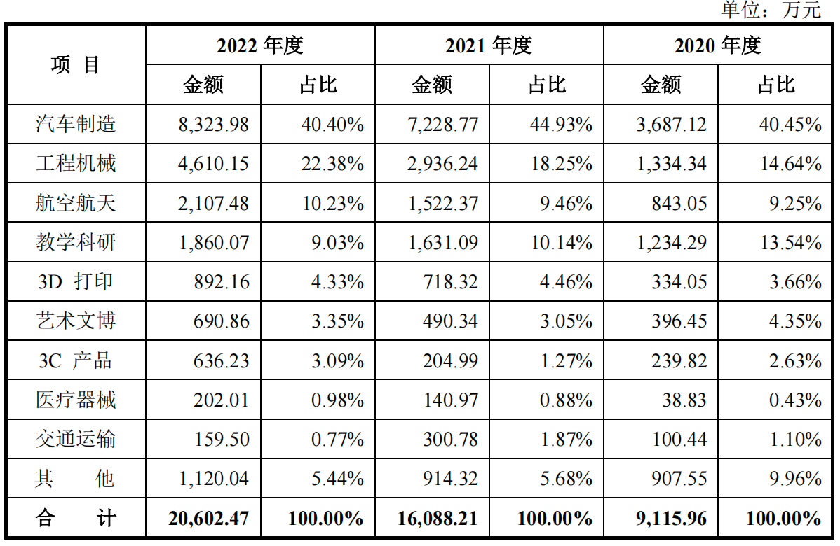 思看科技由三名浙江大学的校友共同创立,是一家“3D扫描仪”供应商,产品包含手持3D扫描仪、掌上扫描仪等。报告期(2020年至2022年)内,思看科技的综合毛利率均在76%以上,汽车制造、工程机械和航空航天是公司产品应用的前三大领域。