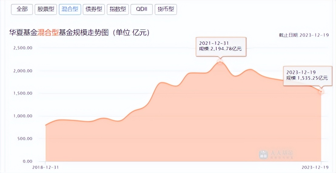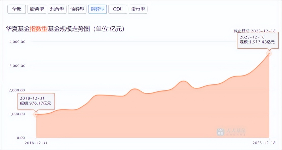 天天基金网数据显示,截至2023年12月18日,华夏基金公司旗下,指数型基金3518亿,混合型基金1535亿,QDII基金787亿。