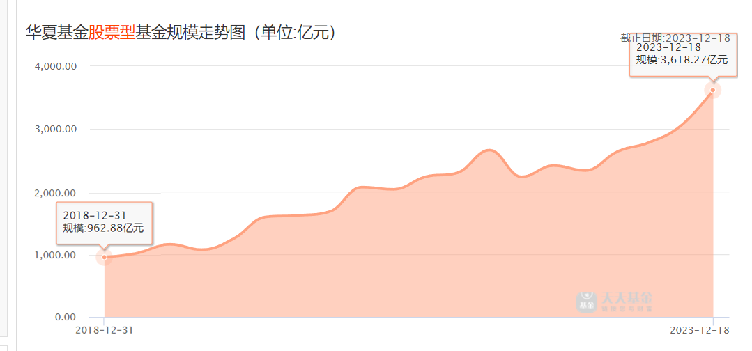 这些年,从华夏基金股票型基金规模走势看,指数型基金无疑是这些年权益产品增长主力军,2018年12月31日,华夏基金指数型基金规模976亿,到了2023年12月18