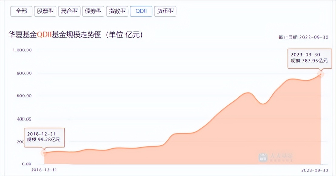 2018年底,其QDII规模仅99.28亿,到2023年9月30日时,已经高达787.95亿,5年间增长693.66%。这两年,随着海外股市的上涨,QDII基金无疑是大赢家。