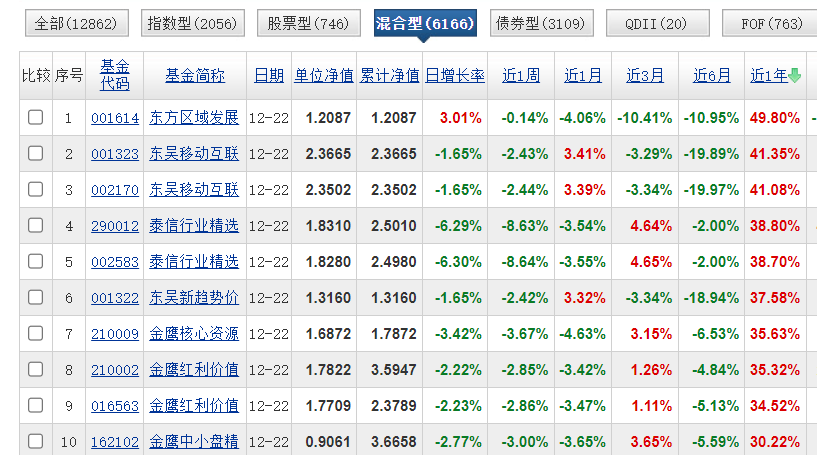 截至2023年12月22日,混合型基金近1年业绩增长TOP10中,总计有4家基金公司的基金进入,其中,公司研究室此前追踪分析过的东方区域发展混合排名第一,上涨49.8%。