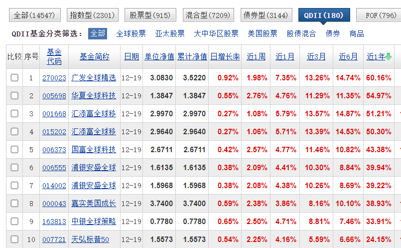QDII是基金资产近1年明星板块,截至2023年12月19日,180只这类产品,业绩成长TOP10中有8家基金公司进入,属于典型的混战。其中,华夏全球科技先锋混合(QDII)(人民币)排名第2,业绩上涨54.97%。