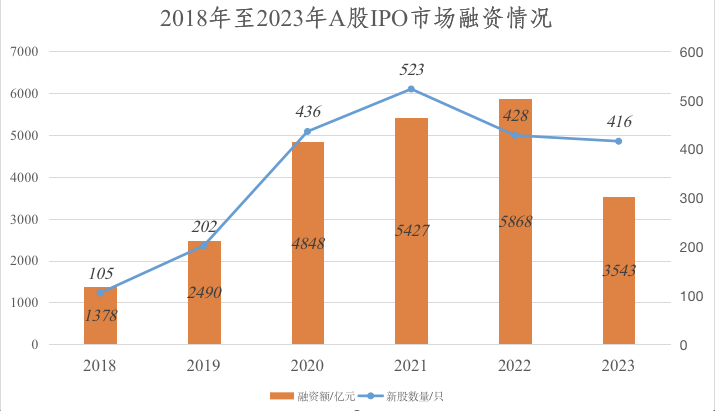 而2018年至2022年,A股IPO融资额分别为1378亿元、2490亿元、4848亿元、5427亿元、5868亿元。