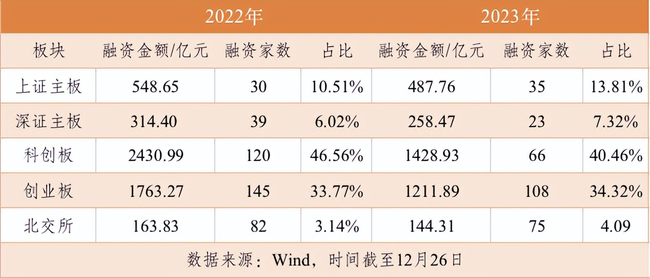 截至12月26日,科创板新股融资额同比减少41.22%;其次是创业板,融资额同比下滑31.27%;深证主板融资额减少17.79%;北交所融资额同比减少11.91%;上证主板融资额同比减少11.09%。
