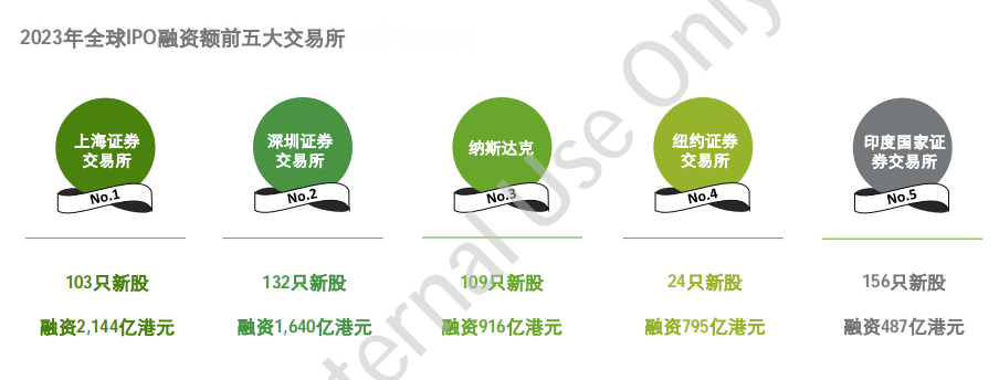 根据德勤报告,2023年全球IPO融资额前五大交易所分别为上交所、深交所、纳斯达克、纽交所、印度国家证券交易所,预估全年融资额分别为2144亿港元、1640亿港元、916亿港元、795亿港元、487亿港元。