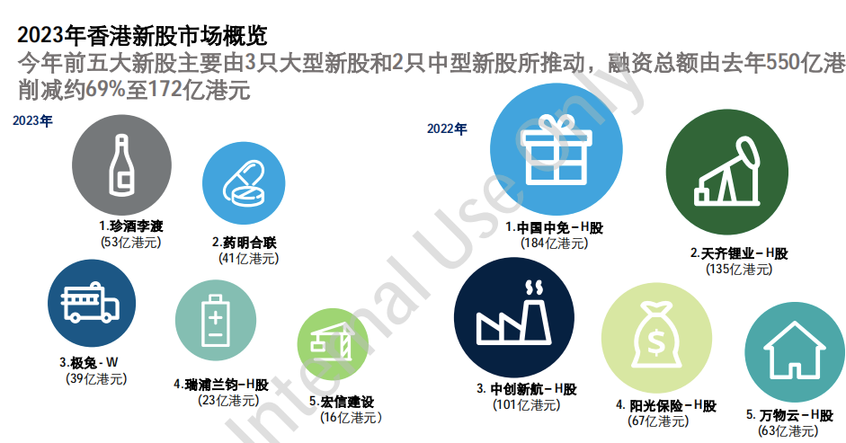 2023年港股前五大IPO项目中,只有三只大型股和两只中型股,分别为珍酒李渡、药明合联、极兔—W、瑞浦兰钧、宏信建设。5家公司融资总额为172亿港元,由上一年的550亿港元缩减69%。