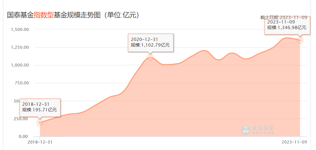在国泰基金资产中,指数型基金规模1346.98亿,在总资产中占比20.86%,属于权益投资中的绝对主力。数据显示,早在2020年底,其指数基金规模就已达到1100亿以上,属于较早关注指数投资的基金公司之一。