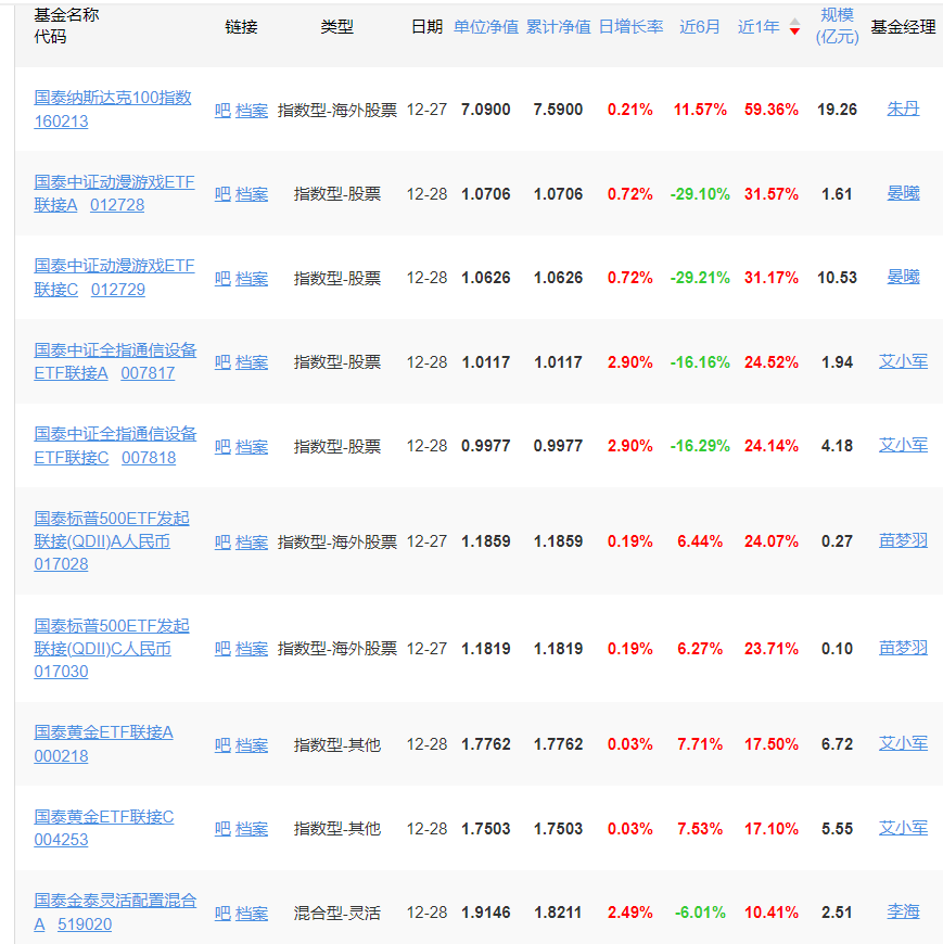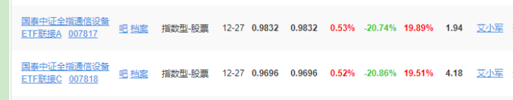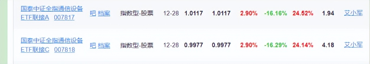 比如,国泰中证全指通信设备ETF联接A,近1年业绩就从12月27日的19.89%,摇身一变为12月28日的24.52%。难怪有分析称,当天的大涨,有基金回补仓位,推波助澜的原因。