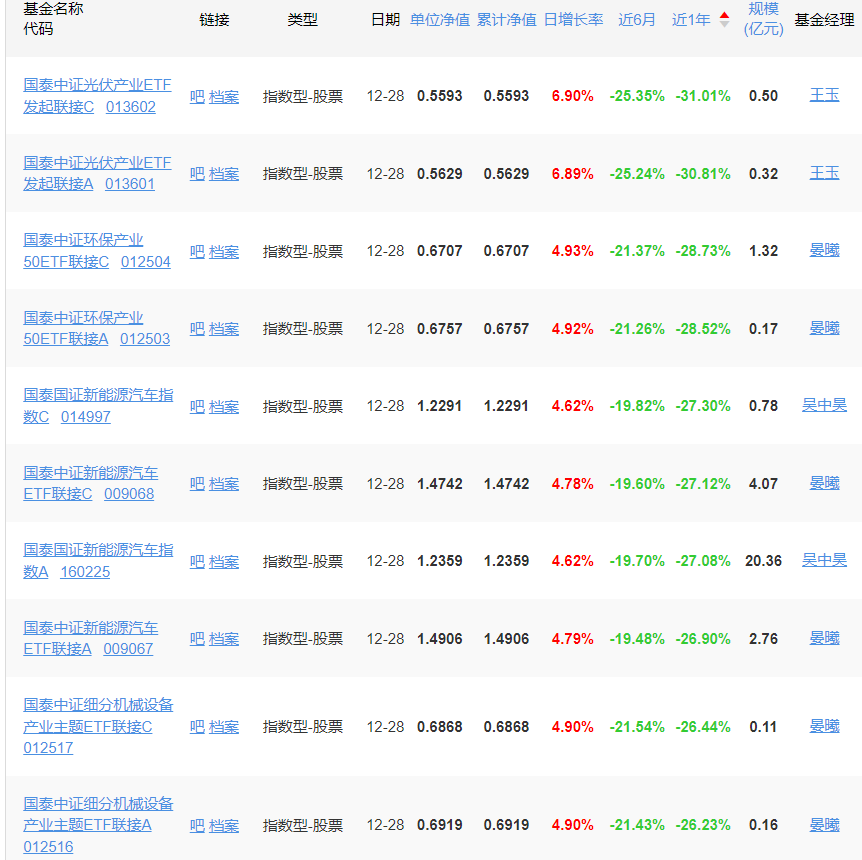 不过,12月28日大涨过后,除了国泰中证光伏产业ETF发起联接C/A当年业绩下跌分别为31.01%、30.81%外,其余排在负增长TOP10的8只基金,下跌幅度全都退回到30%以下。