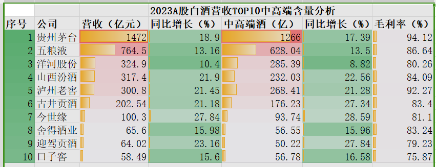 比如,五粮液(000858.SZ)营收站上800亿(含其他收入,白酒收入764.5亿),山西汾酒(600809.SH)、泸州老窖(000568.SZ)营收站上300亿,古井贡酒(000596.SZ)站上200亿,今世缘(603369.SH)站上100亿。